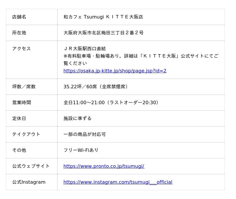 飲食チェーン『PRONTO(プロント)』や『ワインの酒場。Di PUNTO(ディプント)』などを展開する株式会社プロントコーポレーション(本社:東京都港区、代表取締役社長:杉山和弘)は、2026年3月5日(木)に、『和カフェ Tsumugi(以下、ツムギ)』を「KITTE大阪」にオープンいたします。今回の出店でツムギは全国20店舗となります。