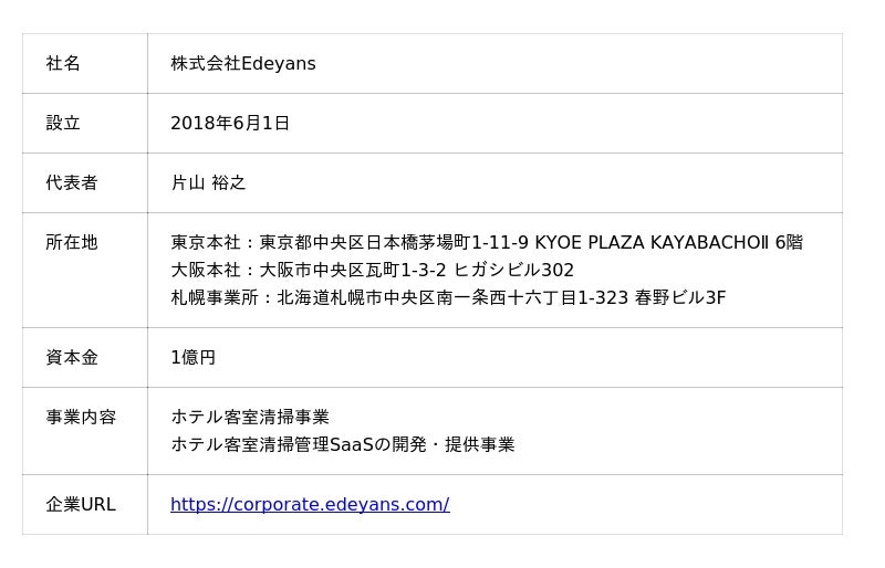 株式会社Edeyans「世界中の宿泊を支え、感動を生む。」をコーポレートミッションに、テクノロジーを用いてホテル客室清掃領域の生産性と労働環境を向上し、日本が世界に誇れる清掃サービスの発展と従事する方々の地位向上を目指して事業展開する会社です。