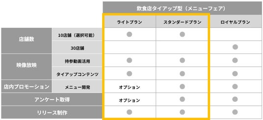 ・ライトプラン:飲食店タイアップメニューの開発や来店客アンケートを行わない小規模な実施を希望する方向け、実施店舗の選定が可能