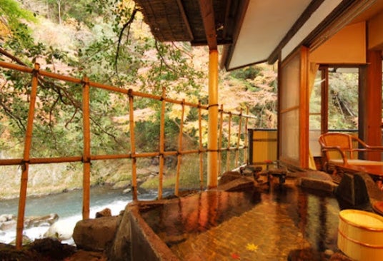 目の前に早川が流れる「塔ノ沢一の湯本館」の客室露天