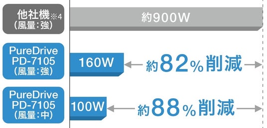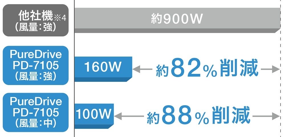 ・・・一般的なヒートポンプ式スポットクーラーでは、熱交換器から発生する熱い排気【※3】が排気ダクトから排出されるため、冷風の当たるポイント以外の周辺温度が上昇してしまうという課題があった。PureDriveは気化冷却式のため、排気口から熱い排気【※3】を出さない「排気熱風レス」を実現した。