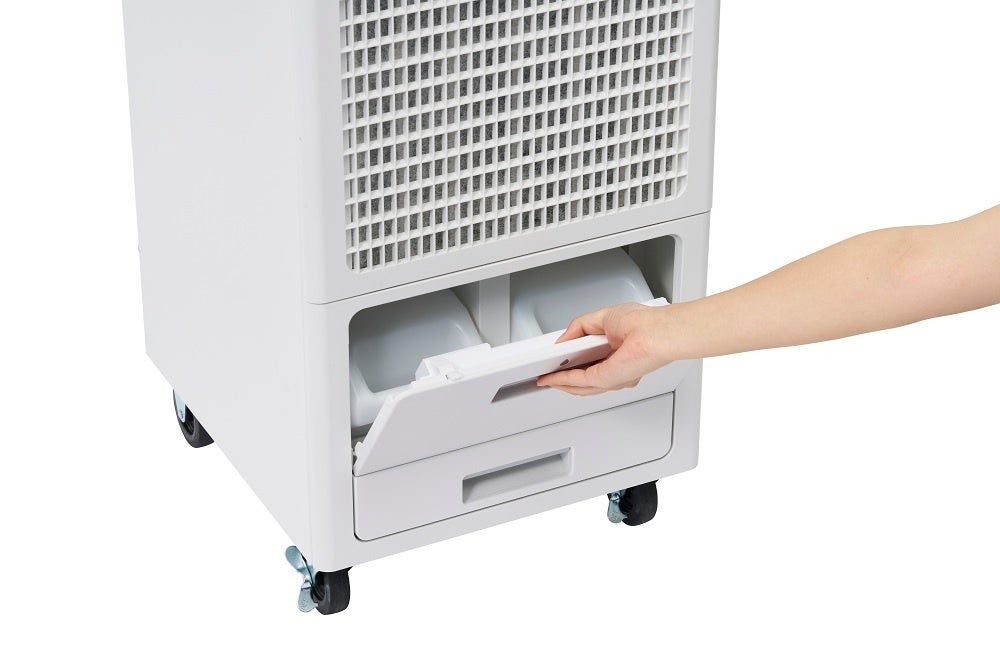 ・・・気化冷却技術を用いているので、ヒートポンプ式スポットクーラーに比べて消費電力が抑えられる。風量「強」でも160Wと省電力で、商業施設やイベント会場など、使用できる電源容量に制約のある場所でも、設置台数を増やすことが可能だ。