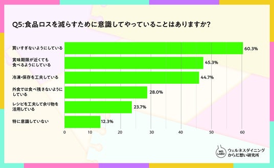 食品ロスを減らすために、回答者の60.3%が食品を買いすぎないようにしていた。また、「特に意識していない」と回答した人は12.3%に留まり、食品ロスを意識した行動をしている人が大半を占める。