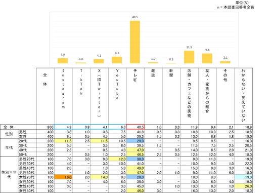 アサイーを初めて知った媒体として最も多かったのはテレビで、4割を超える結果となった。一方、SNS全体(Instagram、TikTok、YouTube、X)は16.1%にとどまり、50代を除いて、年代が上がるにつれて割合が低下する傾向が男女ともに見られた。SNSの内訳では、Instagram、TikTok、YouTube、Xの順に多かった。また、店舗・カフェでの体験や友人・家族からの紹介といった接点も、合わせて約2割を占めた。