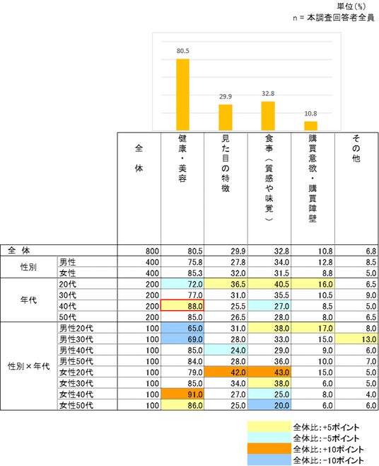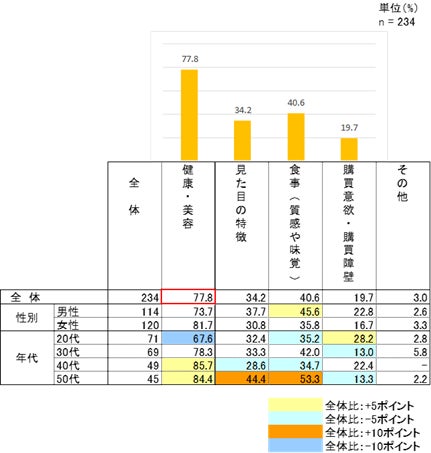 全体で次いで多かった理由は「食事(質感・味覚)」で40.6%だった。50代に着目すると、「見た目の特徴」(44.2%)や「食事(質感・味覚)」(53.3%)が他年代と比べて高い結果となった。