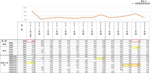 アサイーを知ったタイミングについて見ると、「2012年以前」が全体で10.0%と最も多く、次いで「2024年頃」が7.5%と続いた。各年を通して年代別の大きな差は見られないものの、性年代別では、女性20代において2022年度(11.0%)、2023年度(16.0%)と比較的高い割合が見られた。また、男性30代では2024年頃が12.0%、男性50代では「2012年以前」が17.0%と高い結果となった。