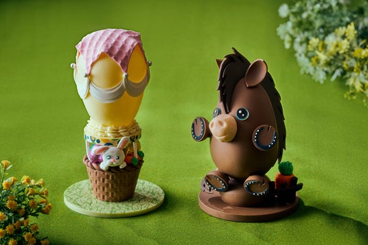 イースターシーズンのテーブルを華やかに彩る存在感のあるチョコレート。イースターの象徴とされるバニーが気球に乗った愛らしいデザインと、成功や前進のシンボルともいわれる干支の午(うま)をイメージし、繊細な細工をほどこしたチョコレートの2種類をご用意いたします。ミルクチョコレートやホワイトチョコレートをつかった優しい味わいを、土台まで余すことなくお楽しみいただけます。