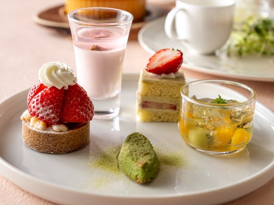 スイーツは甘酸っぱい苺で作ったクランブルタルト、苺をピスタチオと合わせたショートケーキのほか、桜の季節は桜、その後は苺、と時季により食材を変えて作られる2層仕立てのパンナコッタなど、春らしい色合いと味わいのメニューが並びます。キウイフルーツやオレンジなどの爽やかな果物が入った梅の旨みが溢れるジュレは大人の味わいです。