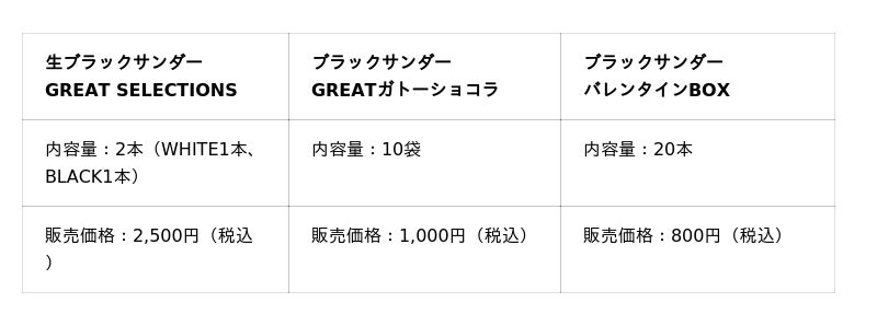 写真左から生ブラックサンダー GREAT SELECTIONS/ブラックサンダー GREATガトーショコラ/ブラックサンダー バレンタインBOX