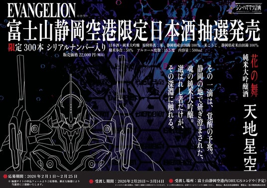 株式会社近藤薬局(本社:静岡県富士市)は、地域連携プロジェクト「シン・ハママツ計画2025」の展開に合わせ、富士山静岡空港限定企画として、『EVANGELION』と連携した純米大吟醸「天地星空」を抽選販売いたします。