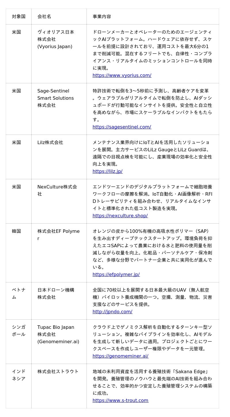 米国、韓国、シンガポール、ベトナム、インドネシアの計5カ国の現地アクセラレーターおよびVCと連携し、約1か月のオンラインレクチャーや、約2週間の現地渡航プログラムを実施しました。参加スタートアップは、海外市場を見据えた事業仮説の検証、現地関係者との商談、イベント登壇を中心とした実践的な海外展開に取り組んでいます。