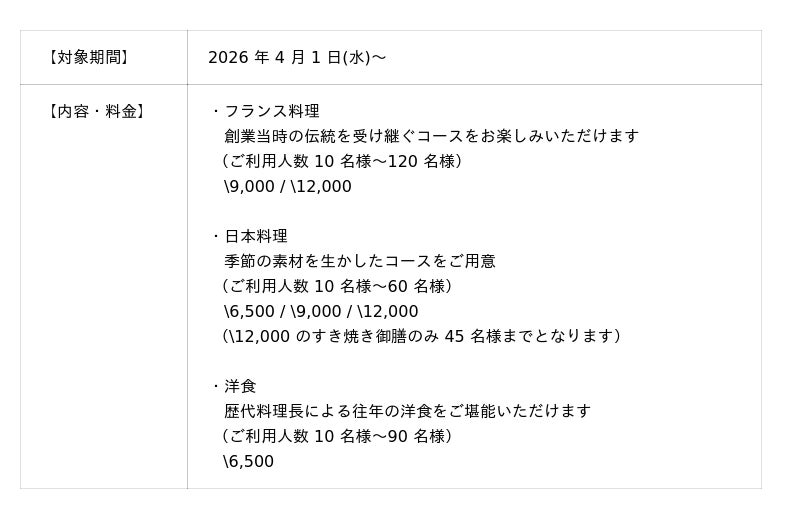国際興業グループの富士屋ホテル株式会社(本社:神奈川県足柄下郡箱根町宮ノ下 359/代表取締役社長 安藤 昭)では、富士屋ホテル(神奈川県足柄下郡箱根町宮ノ下 359/取締役総支配人 飯田 慶)において、このたび「グループランチ」プランを、よりお選びいただきやすい内容に整え、2026 年 4 月 1 日(水)よりご案内を開始いたします。「グループランチ」は、10 名様以上でご利用いただけるご昼食プランとして、フランス料理・日本料理・洋食の各ジャンルにおいて多彩なコースをご用意しております。これまでのラインアップをベースに、用途やシーンに応じて選択しやすい構成とし、開催時間やご人数に合わせて柔軟にご利用いただける内容といたしました。