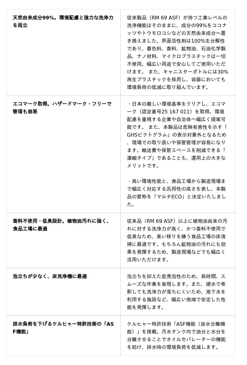 環境先進国であるドイツにルーツを持つケルヒャーは、地球環境への負荷を最小限に抑えるため、天然由来成分を使用した洗浄剤の開発の強化をグローバル方針として掲げています。(※1)本製品は、プロの現場で長く信頼されてきた従来品(RM 69 ASF)と同等の高い洗浄能力を維持しながら、天然由来成分99%を実現しました。これにより、従来品で表示されていたGHSピクトグラム(ハザードマーク)の適用外となり、エコマーク認定も取得しました。(※2)洗浄力はそのままに、床洗浄機からモップ洗浄まで幅広く使用でき、より安全で取り扱いやすく、環境にも人にも優しい製品へと進化を遂げました。