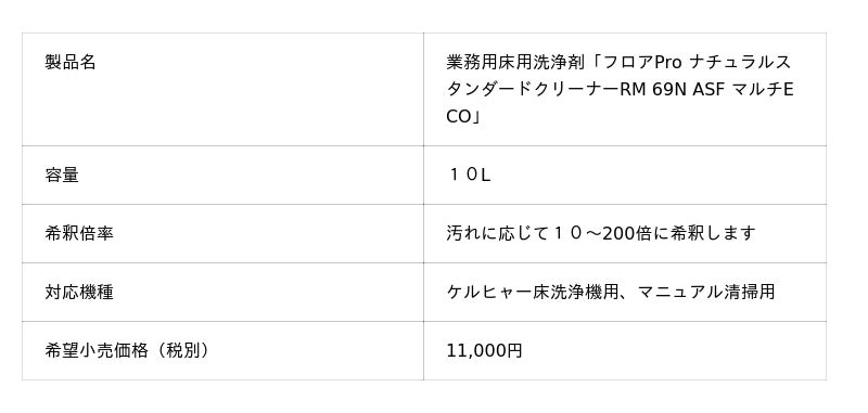 ・業務用床用洗浄剤「フロアPro ナチュラルスタンダードクリーナー RM 69N ASF マルチECO」https://www.kaercher.com/jp/professional/cleaning_agents/professional/floor/everyday-cleaner/rm-69n-asf-62962230.html