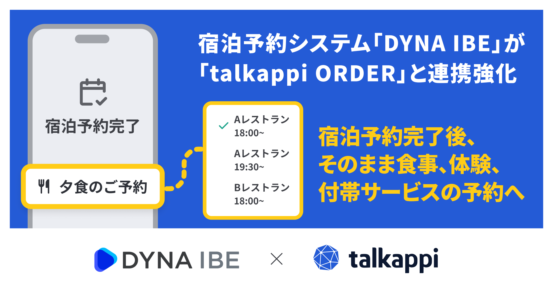 『DYNA IBE』が、付帯サービス予約・手配システム『talkappi ORDER』と連携することで、宿泊予約完了画面上に付帯サービス予約ボタンを表示します。これにより、利用するサービスおよびその利用日時を、宿泊予約時点であらかじめ確定することが可能になります。
