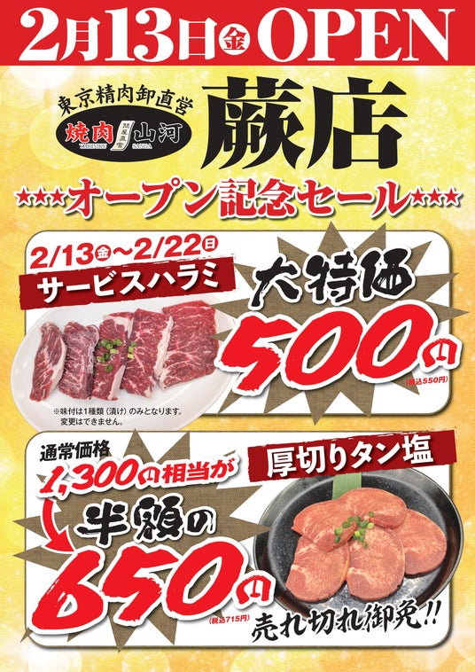 2026年2月13日(金)「肉問屋直営 焼肉山河」 埼玉3号店 蕨店がオープン!