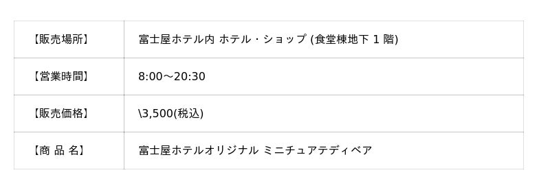 国際興業グループの富士屋ホテル株式会社(本社:神奈川県足柄下郡箱根町宮ノ下 359/代表取締役社長 安藤 昭)では、富士屋ホテル(神奈川県足柄下郡箱根町宮ノ下 359/取締役総支配人 飯田 慶)のホテル・ショップにて、これまでご好評をいただいておりました「富士屋ホテルオリジナルテディベア ベルスタッフユニフォーム」をモチーフとしたミニチュアテディベアの販売を開始いたしました。