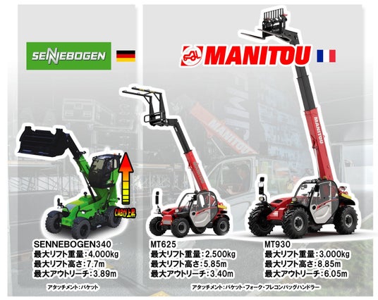 今回の試乗会では、フランスのMANITOU(マニトウ)社と、ドイツのSENNEBOGEN(ゼネボーゲン)社2社のテレハンドラーを試乗していただくことができます。