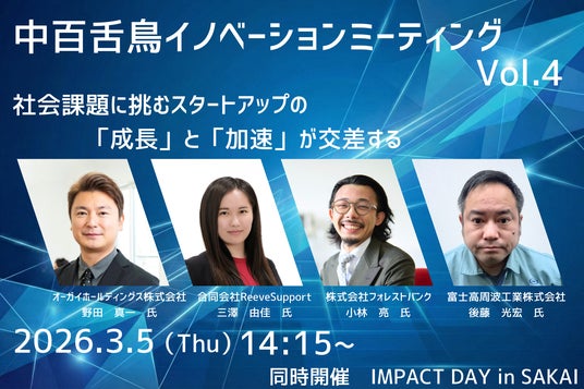 社会課題の解決に強い意志をもつ起業家やイノベーターを育成するプログラム「Sakai Next Impact Catapult」の参加者の発表を行います。(プログラムサポート:株式会社UNERI)