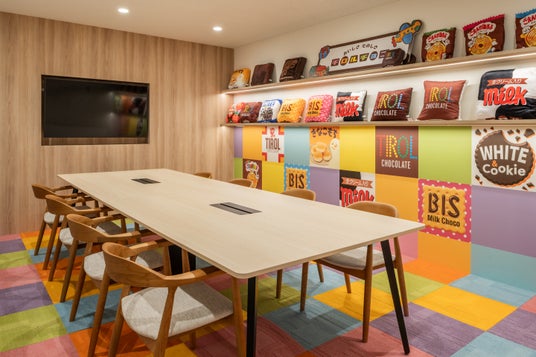 チロルルームと名付けた会議室には大型モニターを設置。壁面にはかわいいチロルのロングセラー商品のデザインをあしらいました。チロルの世界観が一体化したこの部屋からインスタライブの配信などチロルブランド発信や交流の場として活用してまいります。