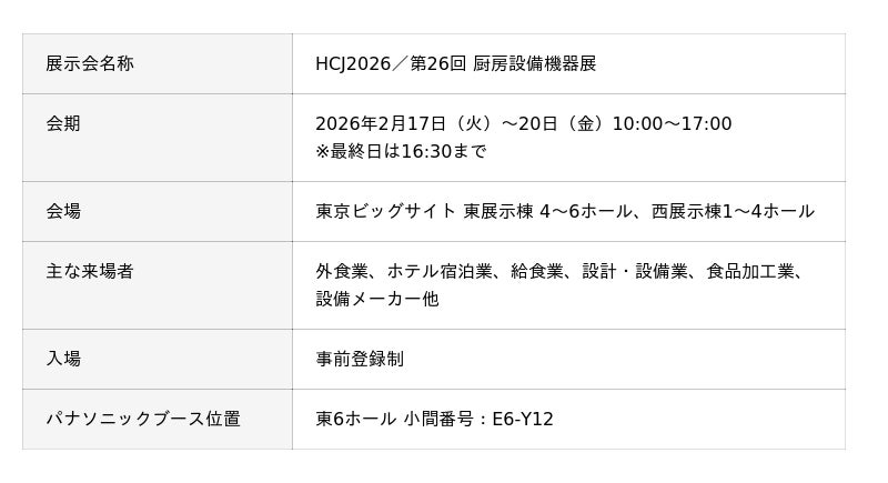 パナソニック株式会社 コールドチェーンソリューションズ社およびパナソニック産機システムズ株式会社は、2026年2月17日から20日まで開催される『「HCJ2026」(主催:一般社団法人日本能率協会)の「第26回 厨房設備機器展」(主催:一般社団法人日本厨房工業会・一般社団法人日本能率協会)に出展し、外食・宿泊・給食事業者に向けて、最新の厨房機器・システムを提案します。