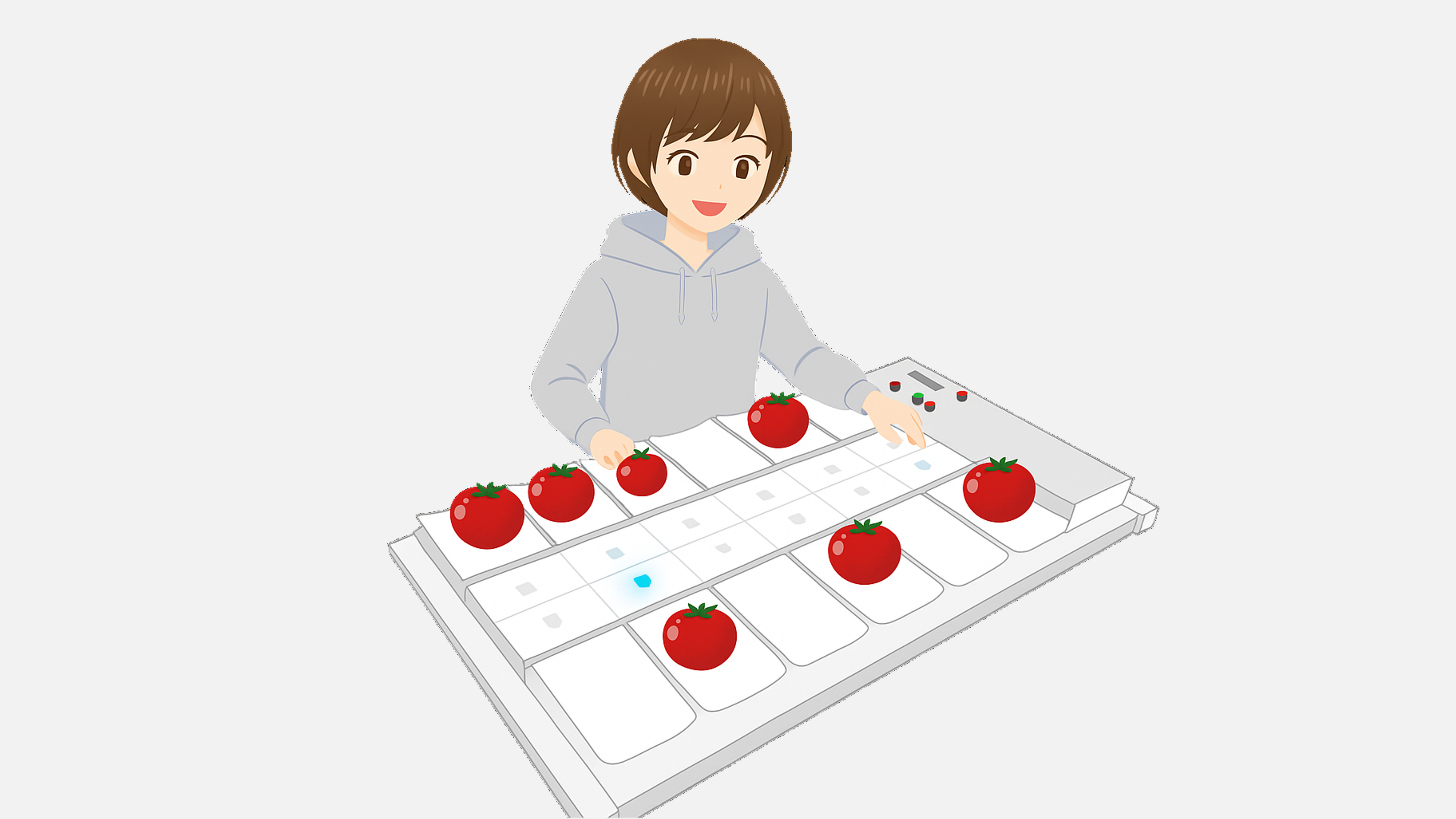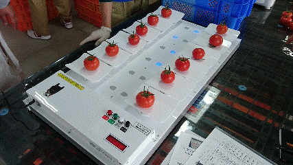 コンピュータが目標重量に最も近い組合せとなるトマトが乗った皿のランプを点灯させることで、作業者はハカリの数字を見ることなく、最適重量となるトマトを直感的に選び出すことができます。