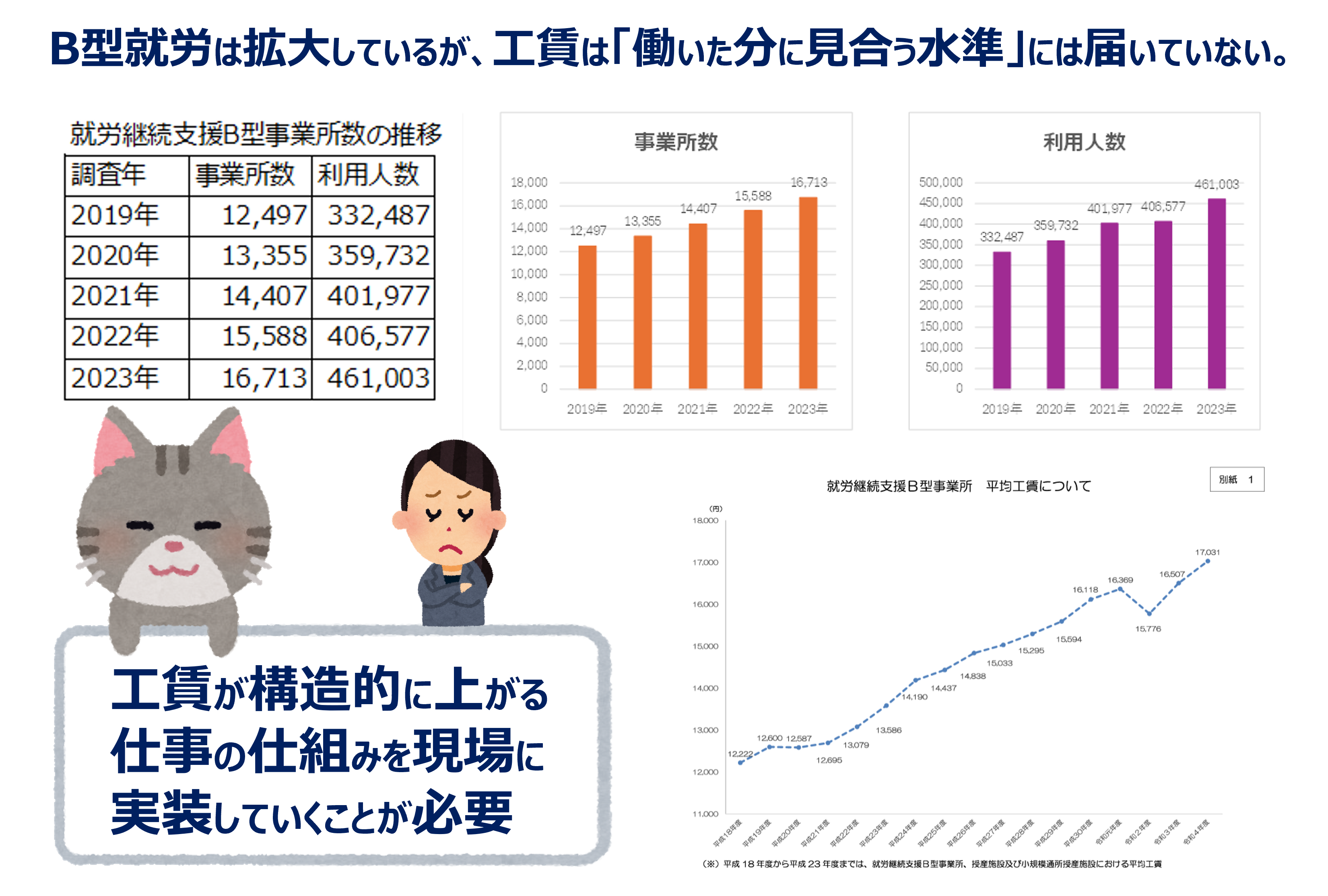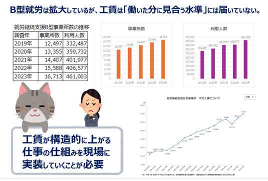 B型利用者が増加しているが、工賃はやや改善されているが十分ではない。