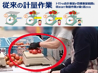 食品のパック詰め現場では、トマトなどを目標重量に合わせる計量作業が欠かせません。しかしこの工程は、「重さを予測 → 置く → 量る → 入れ替える」を繰り返す、経験や勘に強く依存した作業です。
