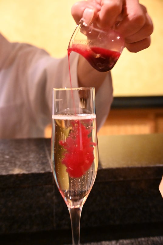 シャンパンにゆっくりと注がれる生き血はとても美しく、特に女性の方には、天然の美容ドリンクとして誉高いアイテムとなっています。