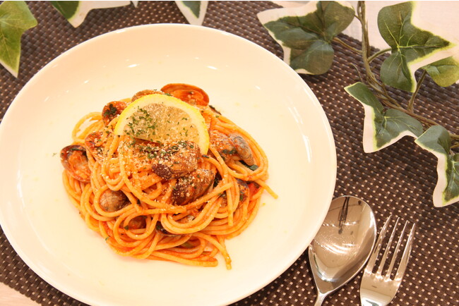 広島県産のあさりと小松菜を使用しました。トマトとあさりのうま味が合わさったトマトパスタで、レモンや粉チーズのトッピングもおすすめです。