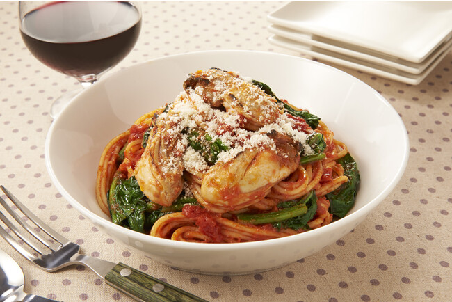「広島県産牡蠣と広島県産小松菜のトマトクリームパスタ」