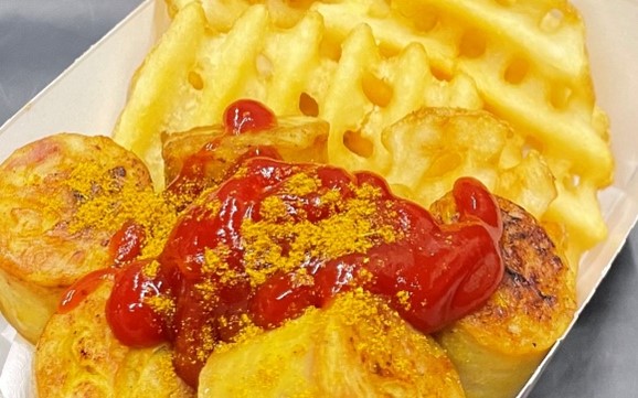 手軽に楽しめるバルメニューのほか、選べるビール・各種アルコール、ソフトドリンクも豊富に取りそろえています。選手コラボメニューをはじめ、ごはんやおつまみ、スナック類も用意。「カリーヴルスト」(写真)は、カレー味のソーセージにケチャップとカレー粉をトッピングし、ビールとの相性ピッタリ。
