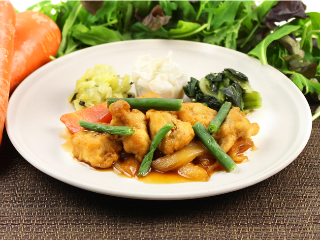 カラっと揚げた三元豚のからあげと、ニンジン、タマネギ、インゲンをさっぱりと食欲のそそる甘酸あんと共にお召し上がりいただく酢豚です。