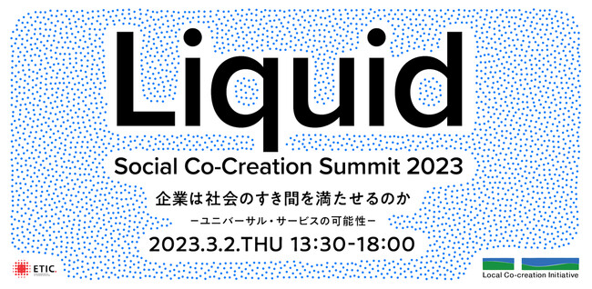 NPO法人ETIC.(エティック、東京都渋谷区)は、日本郵政株式会社と共催で3月2日(木)、「Social Co-Creation Summit Liquid 2023 企業は社会のすき間を満たせるのかーユニバーサル・サービスの可能性ー」を日本郵政グループ本社前島ホール(東京都千代田区大手町)で行います。