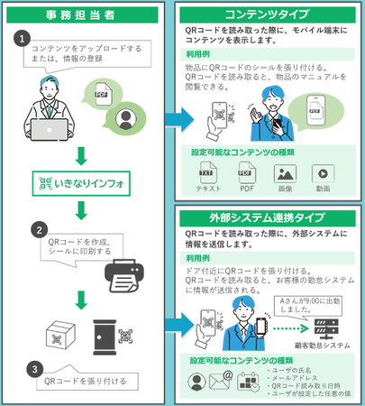 従来のQRコードは不特定多数のユーザーが作成・読み取りが可能であることと、作成されたQRコードは人の目では識別できず、偽物だと判定することは困難なため、フィッシング詐欺や個人情報漏洩のリスクがありました。 本サービスは、特定のユーザーまたはユーザーグループのみがコンテンツにアクセスできるQRコードを作成し、専用アプリで高速かつ簡単でセキュアにアクセスすることを可能とするサービスです。また、QRコードの読み取り情報を外部システムに連携できる機能も備えており、多様な使い方を実現できます。