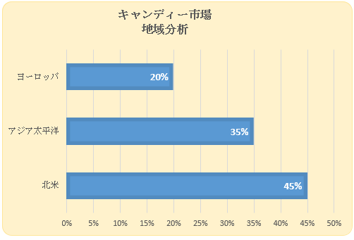 北米地域は、この地域でのキャンディーの需要の増加により、キャンディー市場の主要なシェアを支配すると予想されます。ハロウィーン、誕生日、バレンタインデー、イースターに向けてチョコレートをベースにした菓子を使用する人気が高まっており、市場が後押しされています。それとは別に、この地域に拠点を置く主要なプレーヤーによる製品の発売の増加も、市場に勢いを与えています。