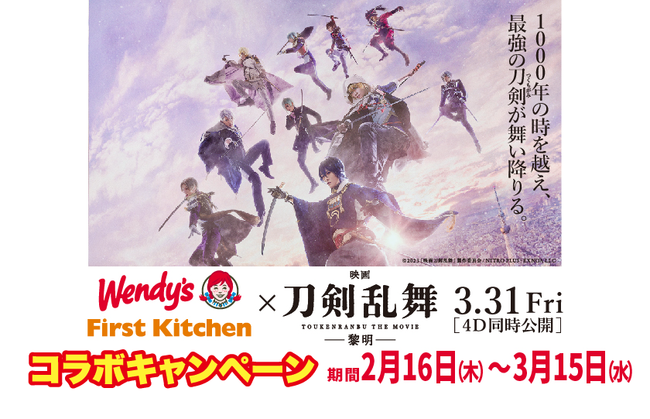 ウェンディーズ・ジャパン株式会社及び、ファーストキッチン株式会社(所在地:東京都新宿区、代表取締役:紫関修)は2月16日(木)から、ウェンディーズ・ ファーストキッチンとファーストキッチン(競馬場店を除く)で、2023年3月31日(金)に公開される『映画刀剣乱舞-黎明-』とのコラボキャンペーンを映画公開に先駆けて開催します。コラボを記念して、1,000円(税込)毎のご購入で、映画刀剣乱舞・ラミカ(全10種)を3月15日(水)までの期間中、数量限定でプレゼントします。数に限りがありますのでお早めにご来店ください。また、2月16日(木)10時より店内BGMで、三日月宗近役の鈴木拡樹さん、山姥切国広役の荒牧慶彦さんのコメントと、映画主題歌 BLUE ENCOUNT「DESTINY」をお楽しみいただけます。さらに!2店舗限定で特別装飾を実施します。特大パネルが設置されるなど、ここでしか感じることのできない世界観をファンの皆さまにお届けしますので、ぜひお楽しみください。