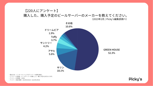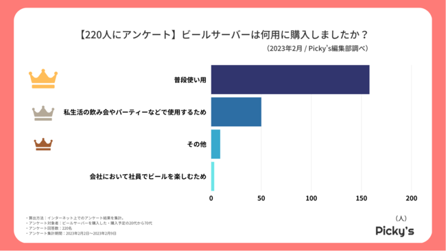 「Picky’s」は、インターネットショッピングにおいて、購入前に試せない・選ぶべきものがわからないという課題の解決を目標に、あらゆる商品のおすすめランキングや検証レビューを紹介するサイトです。このたびPicky’s(https://rentry.jp/note/)では、2023年3月8日のビールサーバーの日に先駆けて、ビールサーバーについてインターネット上でアンケート調査を行いましたので発表いたします。