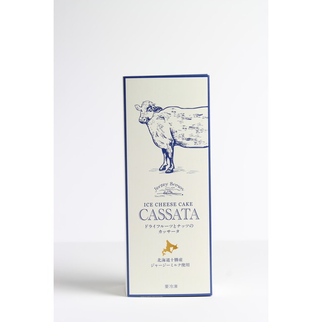 イタリアのシチリア地方発祥のアイスケーキ“カッサータ”を、北海道十勝産ジャージー牛乳とジャージー飲むヨーグルト、100%北海道産のクリームチーズで作りました。ぶどうやクランベリーなどのドライフルーツとナッツがぎっしり詰まった贅沢なカッサータです。ジャージー牛乳ならではの濃厚でコクのある味と、フルーツの程良い酸味やナッツの香ばしさが絶妙にマッチします。