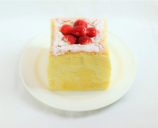ふわふわのシフォンの中にたっぷりのミルキークリームとあまおう苺クリームを絞りました。上部にはミルキーソースと苺を飾った、伊勢丹立川店にて期間限定で販売するシフォンケーキです。