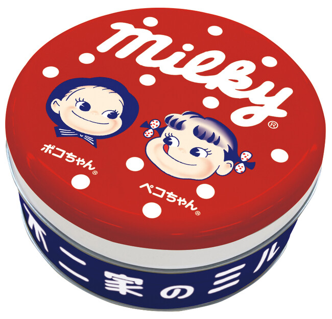 レトロ可愛いデザインのミルキー缶が新登場! 化粧缶はマット素材とツヤ素材で構成し、レトロな雰囲気の中にも高級感が漂います。現在ではあまり見かけない、帽子をかぶったポコちゃんに懐かしさを感じる方もいるのでは? レトロなミルキー缶でノスタルジーに浸ってみてはいかがでしょうか。