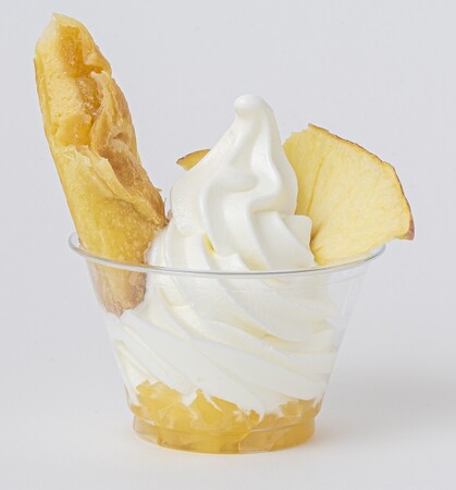 パティシエのりんごスティックは、青森県産りんごを大きめにカットしパイで包んだ、東北土産としても人気のお菓子です。今回、みずみずしい青森県産りんごをしのばせたソフトクリームに、「パティシエのりんごスティック」をトッピングし、りんご尽くしのデザートに仕上げました。