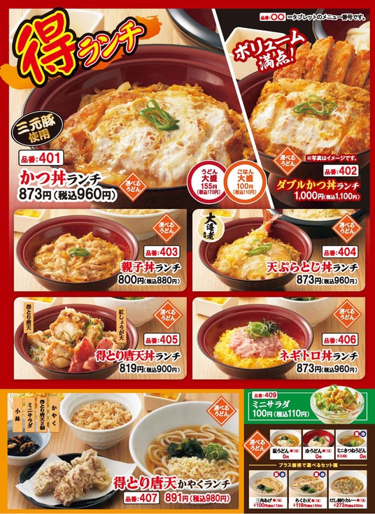 ※プラス価格で・税込+130円で「ちくわ天うどん」・税込+110円「三角揚げうどん」・税込+300円「だし割りカレー」がお選びいただけます。