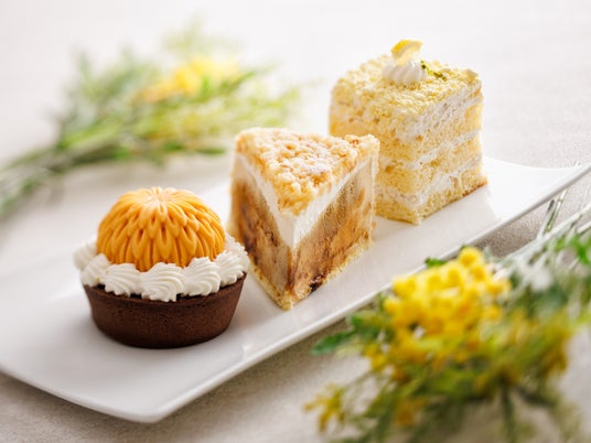 またスイーツは、春らしい軽やかな味わいと彩りにこだわった、3種のケーキをラインアップ。花をかたどったフルーツムースのチョコレートタルトや、2層仕立ての贅沢なチーズケーキ、レモンの爽やかな風味が楽しめるショートケーキなど、食後のデザートのほか、テイクアウトでもお楽しみいただけます。