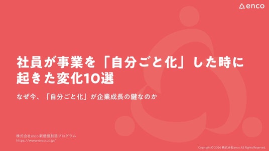 変化の激しい現代のビジネス環境において、社員の主体性と当事者意識の醸成が企業の持続的成長の鍵となっている中、株式会社enco(本社:愛知県名古屋市西区那古野二丁目14番1号、代表取締役:小林延光、以下「enco」)は、社員が事業を「自分ごと化」した際に実際に起きた具体的な10の変化を、理論的背景と受講者事例を交えて解説したホワイトペーパー『社員が事業を自分ごと化した時に起きた変化10選』を本日公開いたしました。