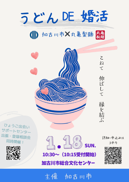 その一環として、2026年1月17日(土)に、加古川市内の施設にて親子うどん教室を開催、1月18日(日)には「うどんDE婚活」として、加古川市こども政策課の方々と地域活性化を促すイベントを共催しました。