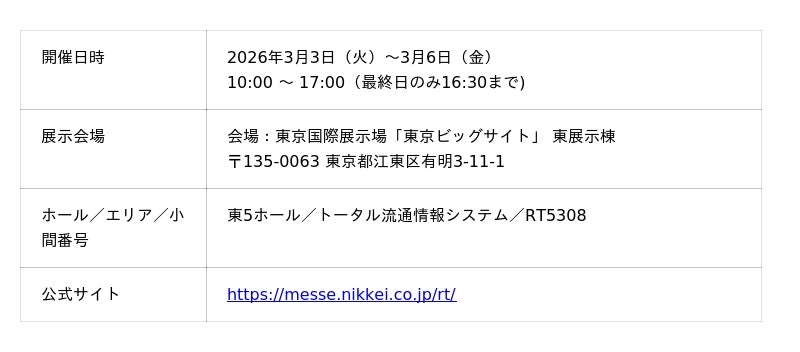2026年3月3日(火)~3月6日(金)、東京ビッグサイトにて開催される「リテールテックJAPAN 2026」に出展致します。