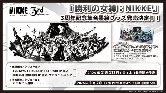 JS貿易株式会社は、戦場に響く銃声と絆~地上奪還ガンガールRPG~『勝利の女神:NIKKE』より、3周年で発表された11体からなる集合絵の墨絵グッズを2026年2月20日(金)より発売することを決定しました。(作画:墨絵師・御歌頭)