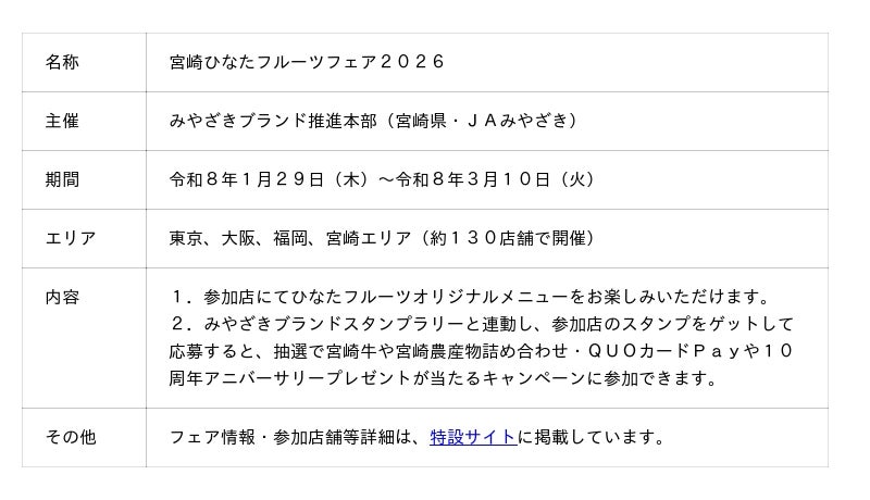 d115850-212-4bca194db6880e9e5e4dec599d49fe8c.pdf みやざきブランド推進本部(宮崎県・JAみやざき)は、東京・大阪・福岡・宮崎エリアの飲食店(約130店舗)と連携し、宮崎が誇る『ひなたフルーツ』(完熟きんかん「たまたま」、日向夏)を使ったオリジナルメニューが味わえる「宮崎ひなたフルーツフェア2026」を3月10日(火)まで開催します。