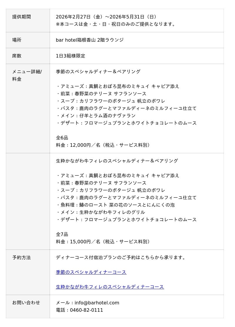 シマダハウス株式会社(東京都渋谷区、代表:島田一成)が運営する bar hotel箱根香山(神奈川県箱根町小涌谷)では、2月27日(金)より、「春の訪れ」をテーマに、土地の魅力を一皿一皿に映したディナーコースの提供を開始いたします。箱根と小田原それぞれの旬の恵みを感じながら、ゆったりとした春のひとときをお過ごしいただけます。各料理には、当館バーテンダーによるオリジナルカクテルをペアリング。料理とカクテルが織りなす調和をご堪能ください。館の中心にあるthe barやラウンジでは、時の移ろいとともに表情を変える桜を眺めながらお過ごしいただけます。1日3組様のみの特別なご滞在プランです。